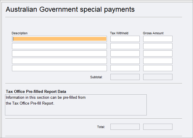 • Click the field - Press enter to open Australian government special payments and press enter at Item 24 - Other income.