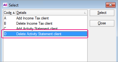 - You can no longer use Code D - Delete Activity statement client. You'll see the rejection error: Notification of Delete Activity Statement Client is no longer available from AE/AO Tax when lodging.