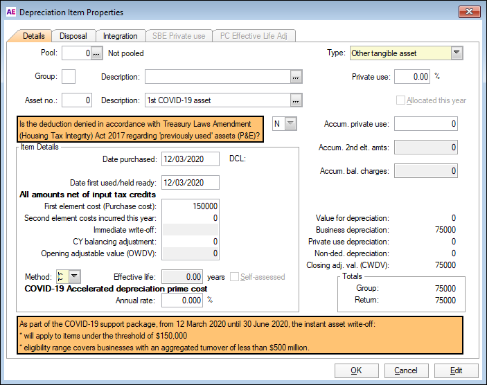 In the depreciation worksheet (d), we've added 2 new COVID-19 depreciation method codes for prime cost and diminishing value.
