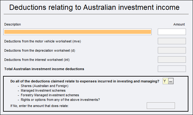 If you change the answer to No, then you must enter the amount of the Total Australian investment income deductions in the field provided as this amount will affect the amount of Franked Distributions available for distribution to presently entitled beneficiaries at item 54.