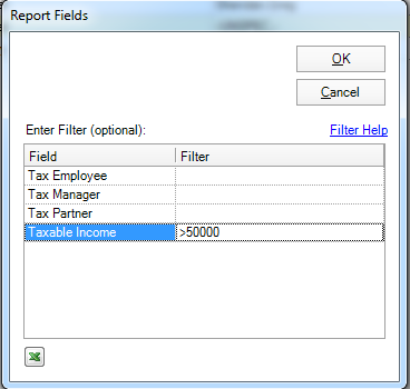 Enter the value that the search should use to determine a match from your Tax clients. In this example ‘>50000’ is entered for Taxable income.