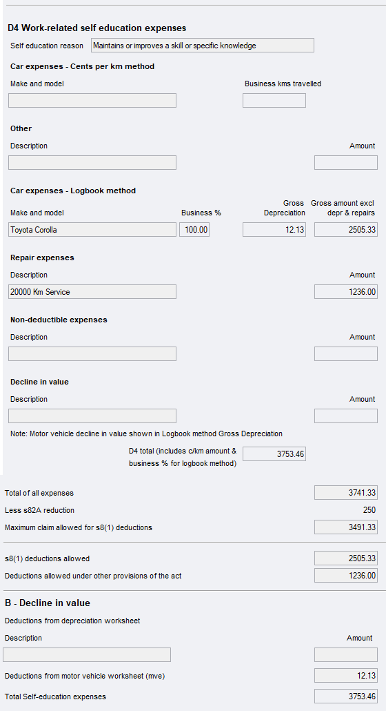 Enter the self-education expenses under the correct category (for example, A, B, C, D and E, because when working out what you can claim, certain costs are reduced by $250).