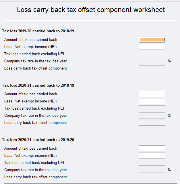 If you have a tax loss in the income year 2019-2020, you can carry it back to tax loss year 2018-2019. Complete the first section (Tax loss 2019-20 carried back to 2018-19). The third component will be disabled.