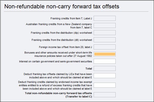 Adjustment fields are provided for franking offsets that have been included at label C but that are refundable at label E. the amounts entered will be pre-filled into the relevant fields in the Refundable tax offsets dialog at label E.