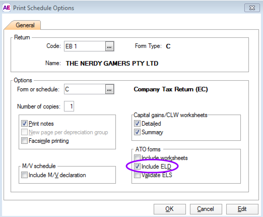 On the Print Schedule Options screen, tick theInclude ELDcheck-box under ATO forms on the lower right-hand side.