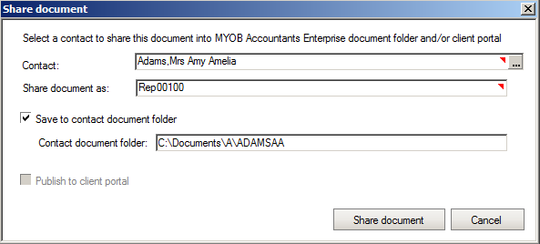 Click OK. The document is saved to the client document folder and the Publish to [Client Portal Name] portal page in MYOB Accountants EnterpriseOffice Live opens where [Client Portal Name] is the name of the client portal that you are publishing documents to.