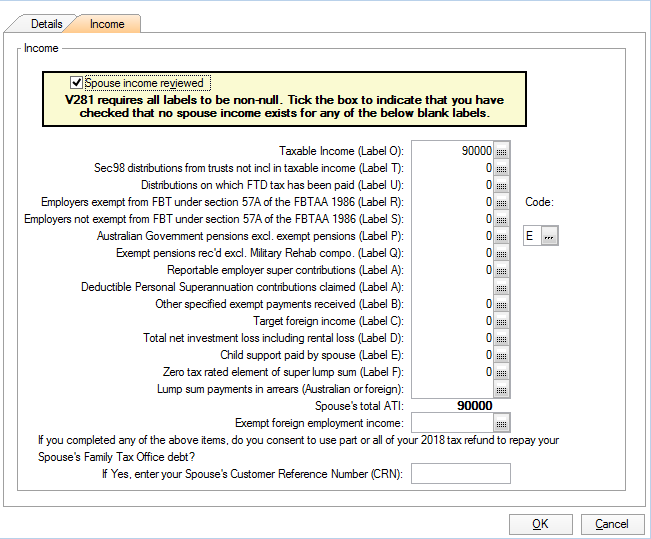 If subsequently you alter any values in the spouse’s return, you'll need to refresh the spouse’s details in the taxpayer’s return by again using the F10Fetch spouse details functionality.