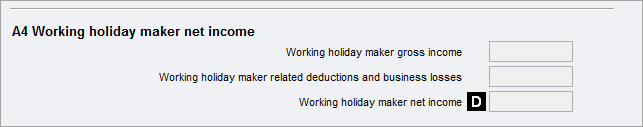 The working holiday maker net income worksheet is completed at item A4 in the Individual return. Integration to this worksheet is from Foreign or Australian PAYG Payment Summaries with the Code H, entered at Item 1 - Salary or wages.