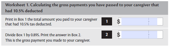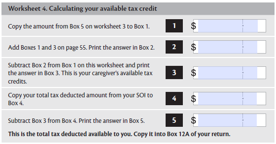 To help determine your allowable deduction, you’ll first need to determine your caregiver’s gross payments. Complete worksheets 1 to 3 and include the amount from Box 5 at Box 12C of your IR3 return.