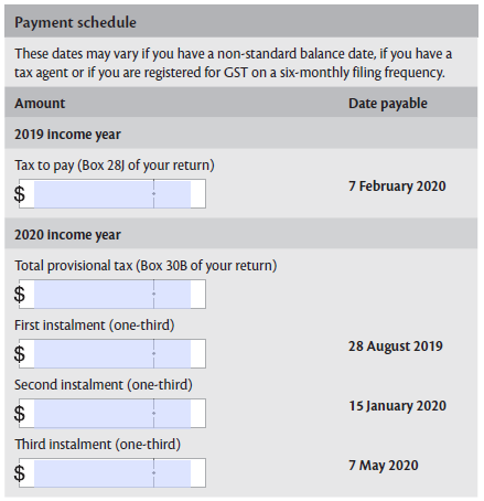 If you have tax to pay, you must pay it by 7 February 2020. If you have an agent and a standard balance date you may have until 7 April 2020 to pay. If you think this may apply to you, please contact your agent for more information. You can pay earlier if you want to.