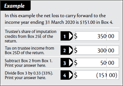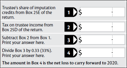 If the trustee’s share of the imputation credit exceeds the tax on trustee income at Box 25D, the excess credit can’t be refunded. Write 0.00 in Box 25F. The excess credit is converted to a net loss to carry forward to the following year.