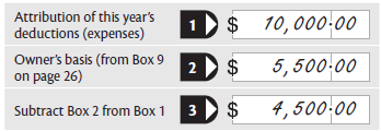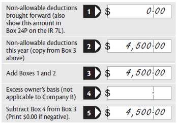 Box 3 is Sam’s non-allowable deductions this year. The amount in Box 3 ($4,500) is shown at Box 24O.