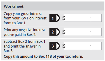 Write the total of all RWT deducted in Box 11A. Add up all the gross interest amounts (before the deduction of any tax) and write the total in Box 11B.