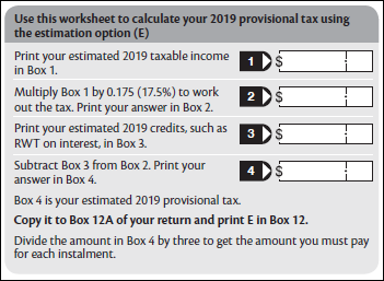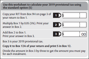 If you use this option, write S in Box 12 of the return and the amount of 2019 provisional tax in Box 12A. 2019 provisional tax is the 2018 RIT plus 5%.