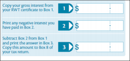 Deduct the allowable negative interest component using the worksheet below before entering the gross amount at Box 8 of the tax return. In all other cases the negative interest is deductible in a later tax return when the term deposit matures.