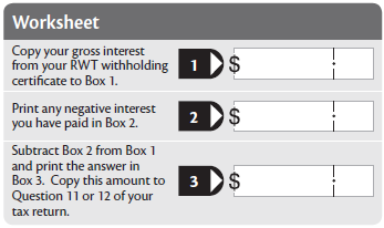 Deduct the allowable negative interest component using the worksheet below before entering the gross amount at Question 11 or 12 of the return. In all other cases, the negative interest is deductible in a later return when the term deposit matures.