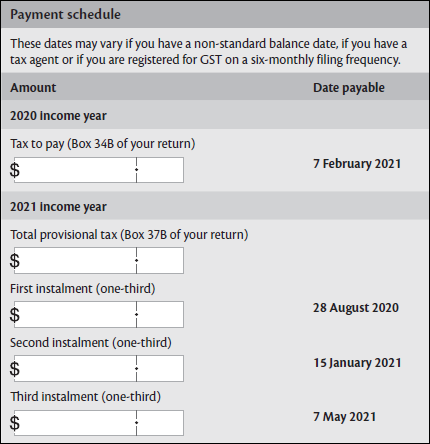 The dates on the schedule apply to a person with a 31 March balance date. If your balance date is different or you are registered for GST on a six-monthly filing frequency or if you have a tax agent, your payment dates may be different too. If you aren’t sure, check with your tax agent or call Inland Revenue.