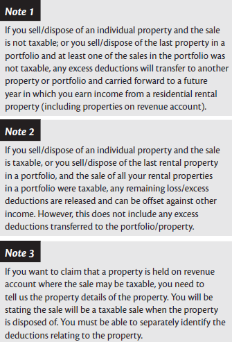 - excess deductions released as the result of the taxable disposal of the rental property or all portfolio properties.