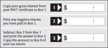 Deduct the allowable negative interest component using the worksheet below before entering the gross amount at Box 10 of the tax return. In all other cases the negative interest is deductible in a later tax return when the term deposit matures.
