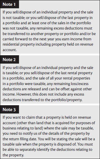 - excess deductions released as the result of the taxable disposal of the rental property or all portfolio properties.